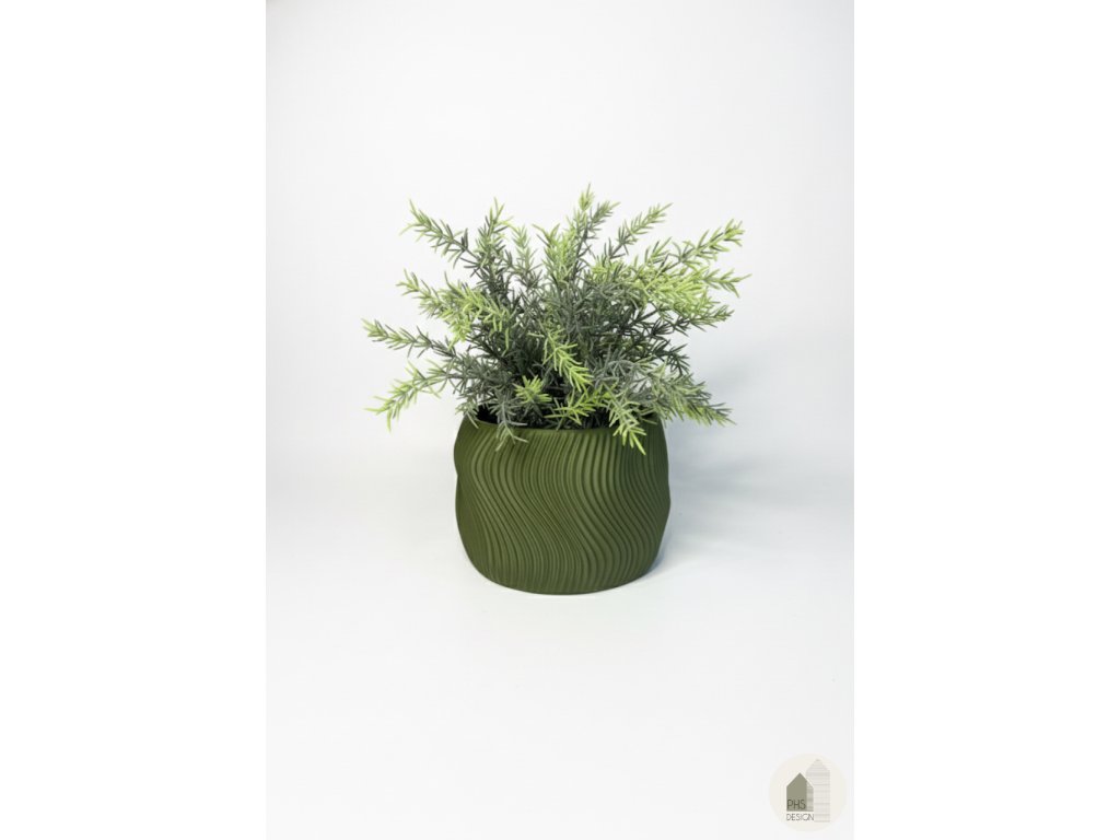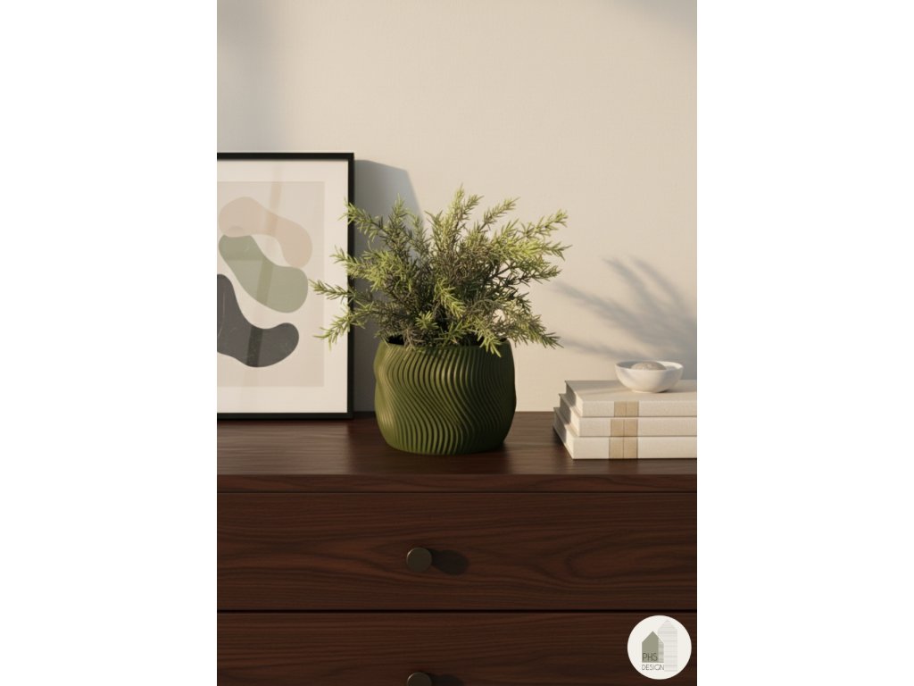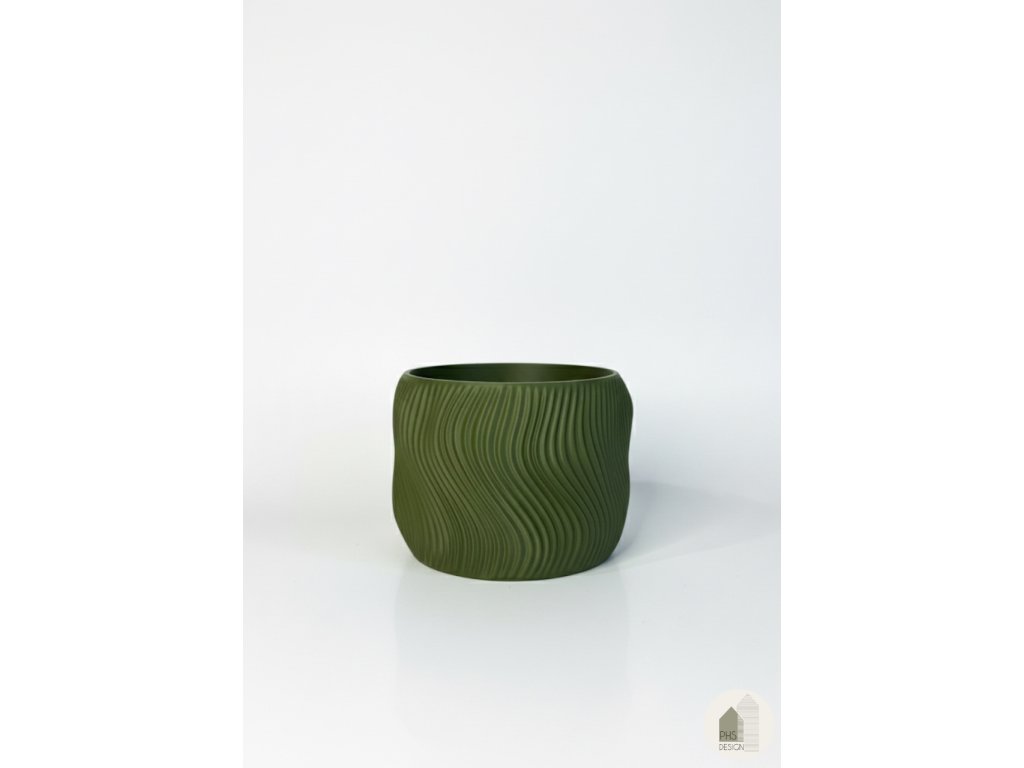 Štýlový 3D tlačený kvetináč, ktorý zaujme svojou charakteristickou vlnovou textúrou. Jeho plynulé línie dodávajú dizajnu jemnú dynamiku a príjemný organický vzhľad. Vyrobený z ekologického PLA v elegantnom olivovo zelenom odtieni pôsobí nadčasovo a zapadne do každého moderného interiéru.