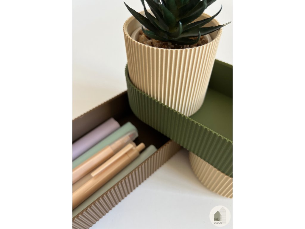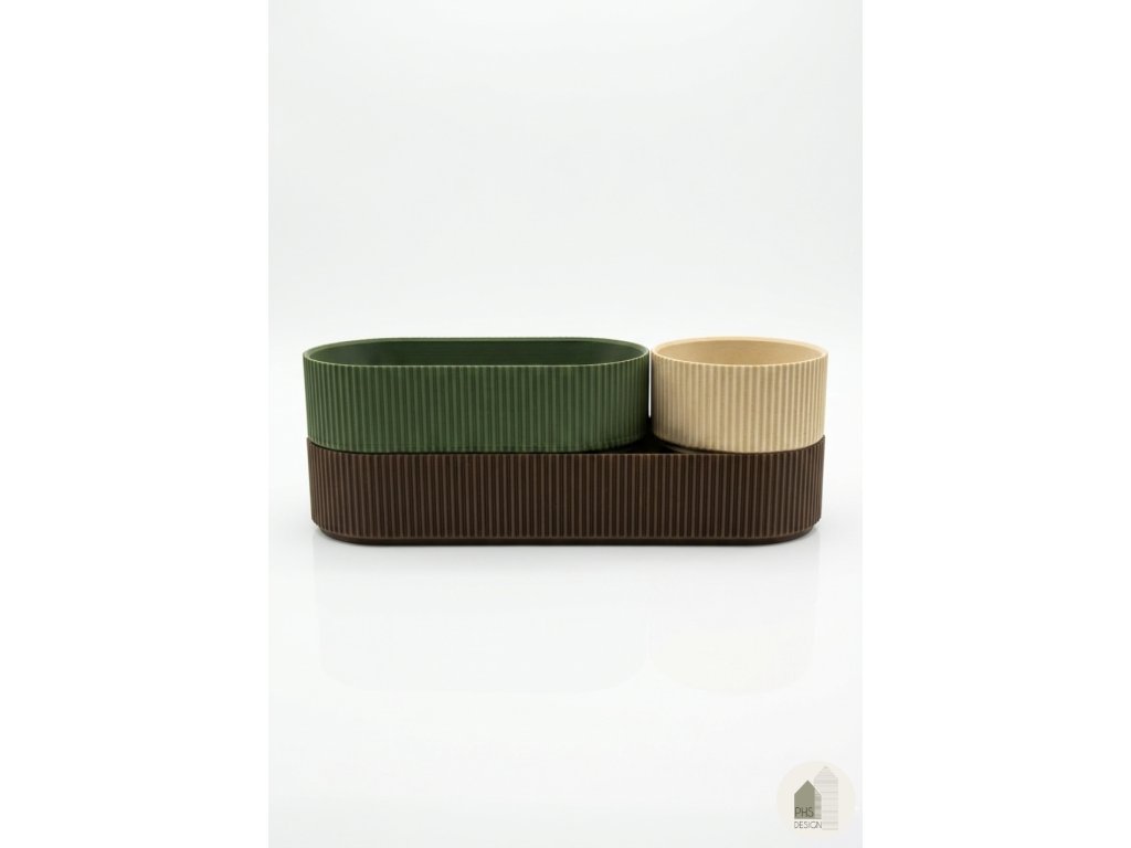 Jednotlivé časti môžeš kombinovať, vrstviť alebo používať samostatne – na pracovnom stole, v kúpeľni, kuchyni či obývačke. Zemité farebné tóny a čisté línie dodávajú priestoru poriadok, pokoj a nadčasový charakter.