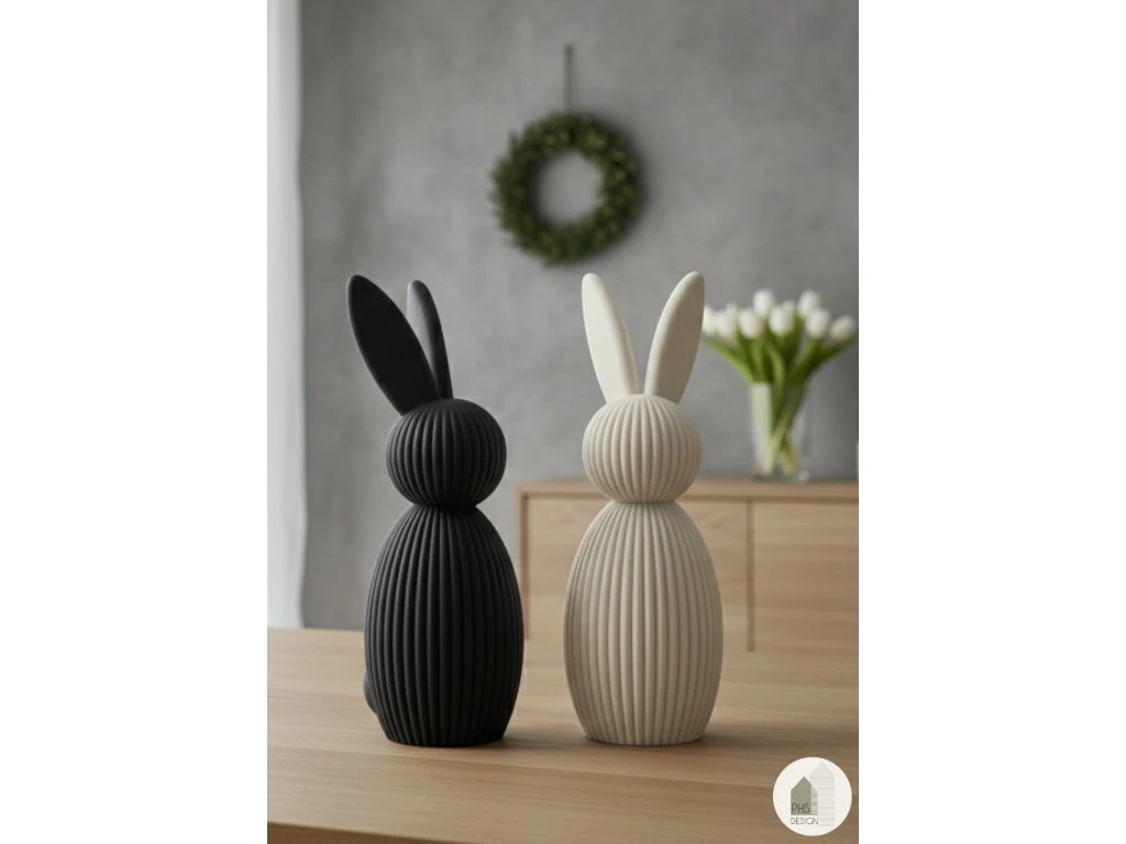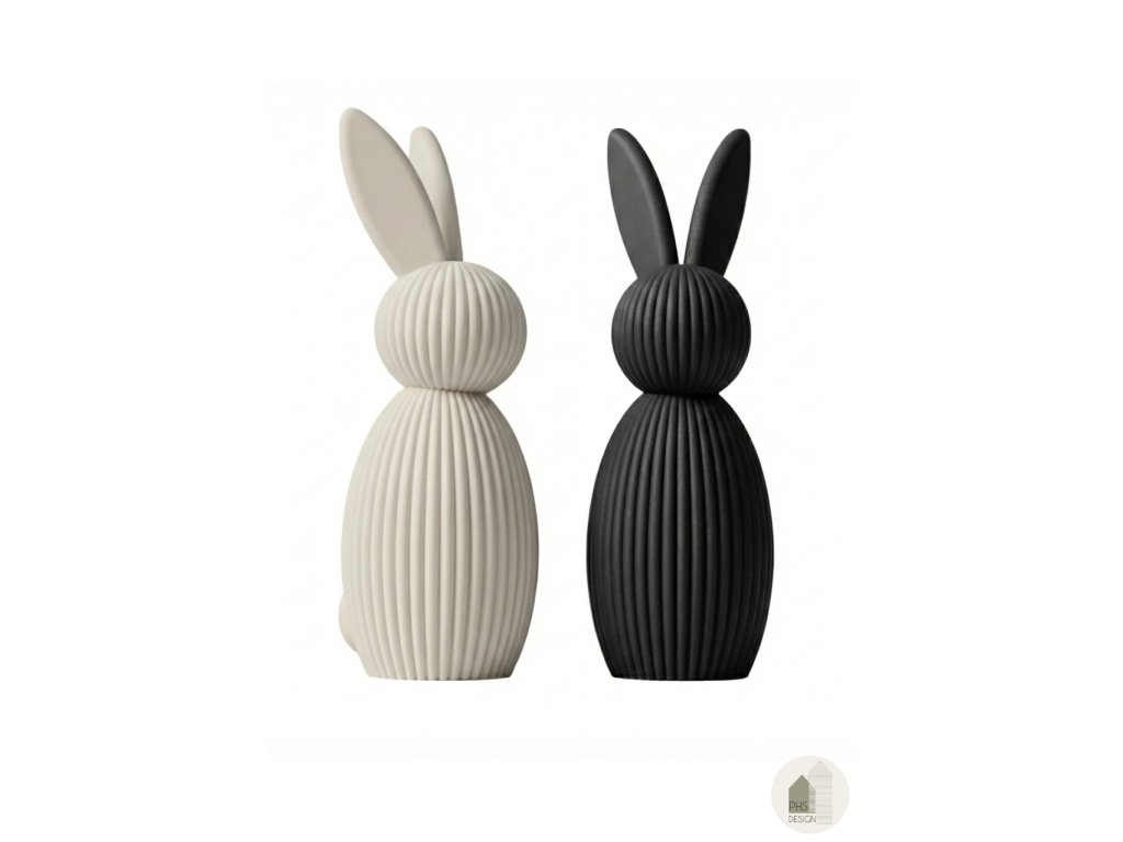 Tieto veľkonočné zajačiky spájajú hravosť sviatkov s čistým, moderným dizajnom. Jemná rebrovaná štruktúra a jednoduché tvary vytvárajú nadčasový dekoratívny objekt, ktorý zapadne do minimalistického aj škandinávskeho interiéru.